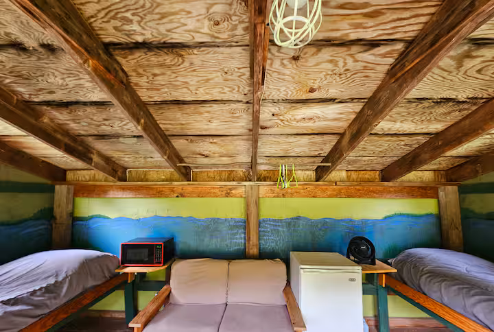 Enjoy a peaceful stay in the Meadow View Rustic Camping Cabin centrally located in main camp. The cabin faces southeast and gets great morning sunshine. The cabin includes Wifi, a mini-fridge, a microwave, a fan, 2-twin beds, and outside a fire-pit, grill & picnic table. A great place to work virtually and be close to nature. The camp is adjacent to a state forest with 20 miles of trails for hiking and mountain biking. Give yourself a quiet relaxing retreat experience in this rustic cabin in a woodland setting. The parking area, shower-house and community pavilion are close to the cabin for easy convenience. The camp is located just 12 miles from Ithaca, NY, home of beautiful waterfalls and gorges. Pets are allowed with approval. Please read Pet Policy. (Unavailable – Meadow View is booked full for the 2026 Camping Season.)