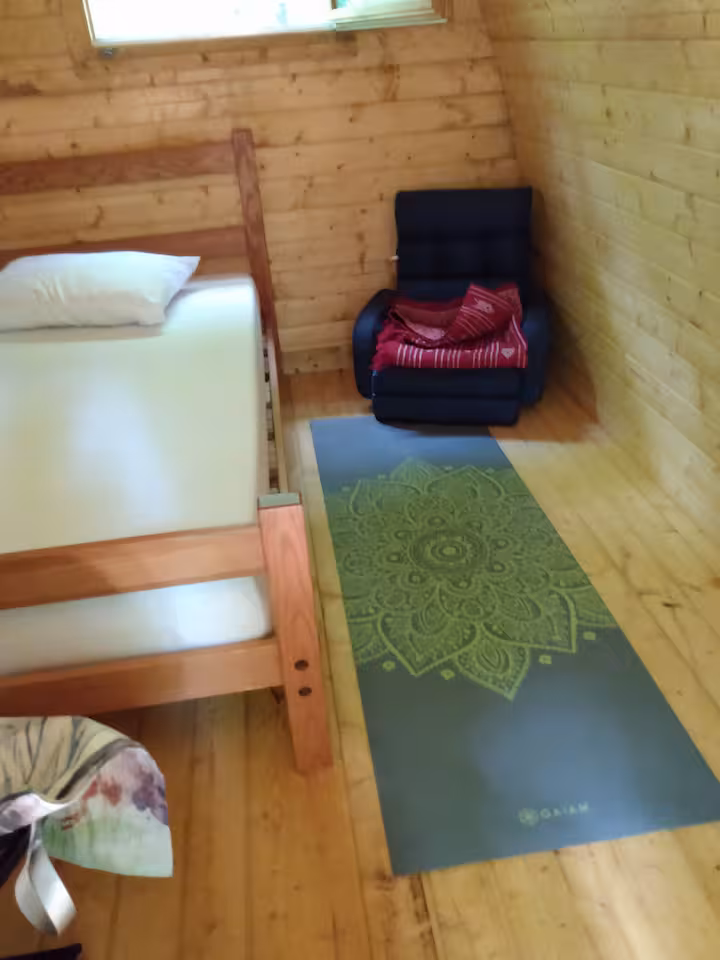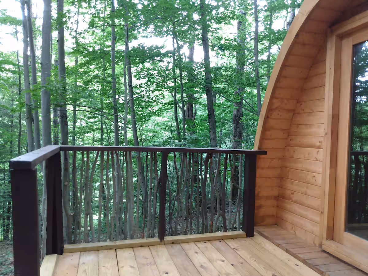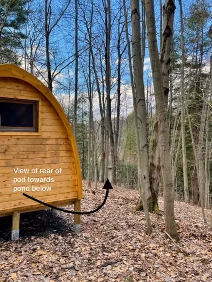 The Lookout Pod is a unique and special non-electric wooden cabin for the solo outdoor adventurer. This pod is dedicated to a beloved Outdoorsman who was part of the Camp Earth Connection family. It offers privacy in a forest setting and sits on the edge of a hill overlooking the wildlife pond through a forest of hardwoods & pines. It has a single bed, lantern, fan and small desk and dresser. It is a short 2-3 minute walk to the parking area and the main camp where the shower house, community pavilion and WiFI as well as a charging station is located. It is adjacent to a state forest with miles of hiking and mountain biking trails. Pets are not allowed in this pod.